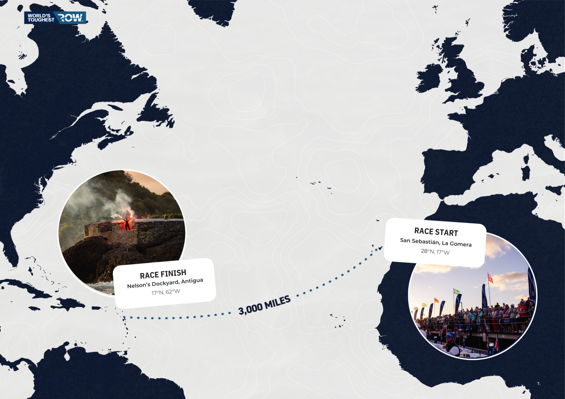 The World's Toughest Row, Atlantic Challenge traverses 3000 miles from San Sebastian in La Gomera, Canary Islands, Spain (28N 18W) to Nelson’s Dockyard, English Harbour, Antigua (17N 61W).